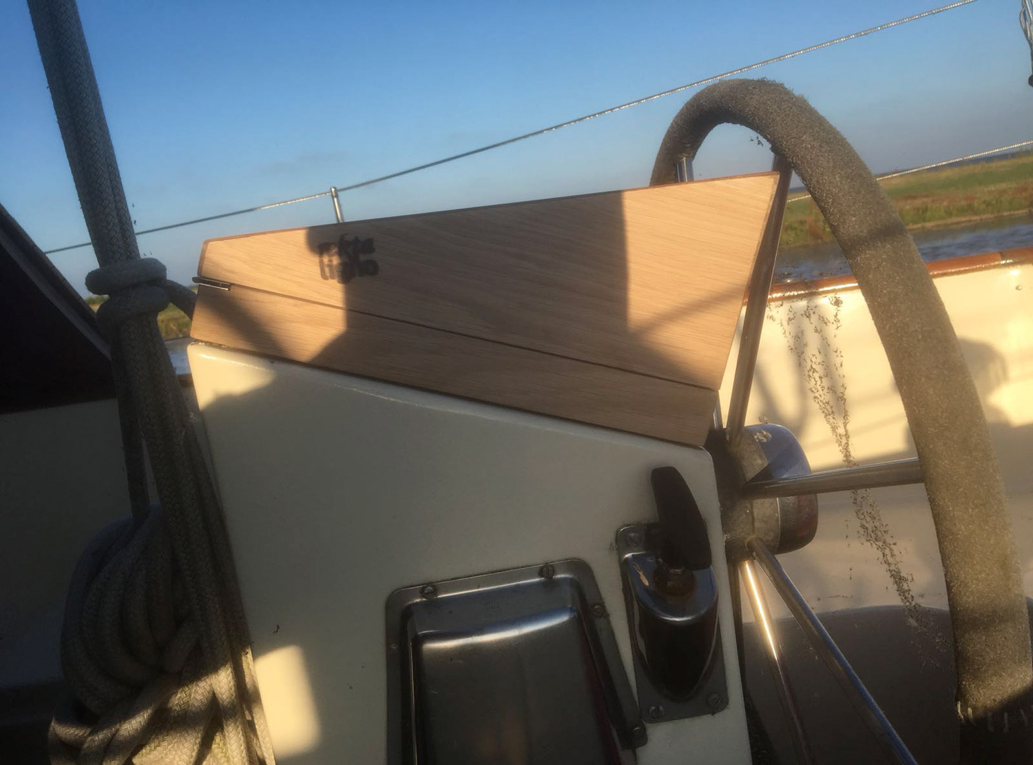 Openklapbare eiken kist voor over het instrumentenpaneel op een zeilschip. Tijdens het zeilen is de kist gesloten en de vrijwel horizontale bovenkant dient dan als tafeltje voor de schipper. Met name handig voor waterkaarten en andere benodigdheden, zoals een kop verse koffie.