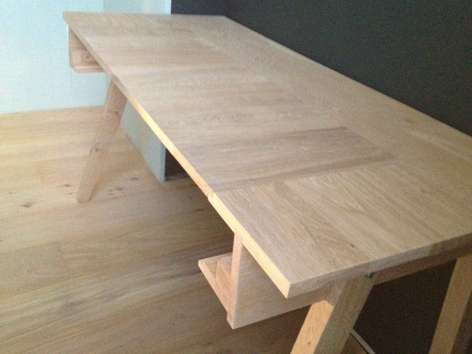 Eiken desk voor in muziekstudio met opbergruimte voor een toetsenbord. Door een deel van het bovenblad naar onderen te plaatsen kan het toetsenbord naar voren geschoven worden.