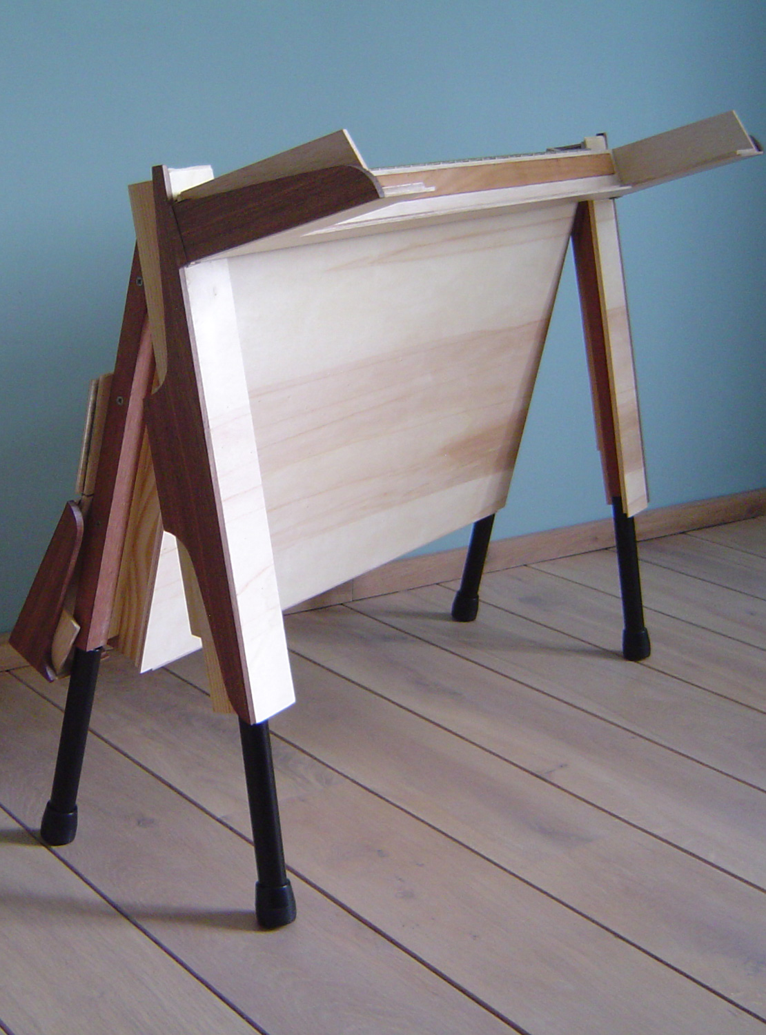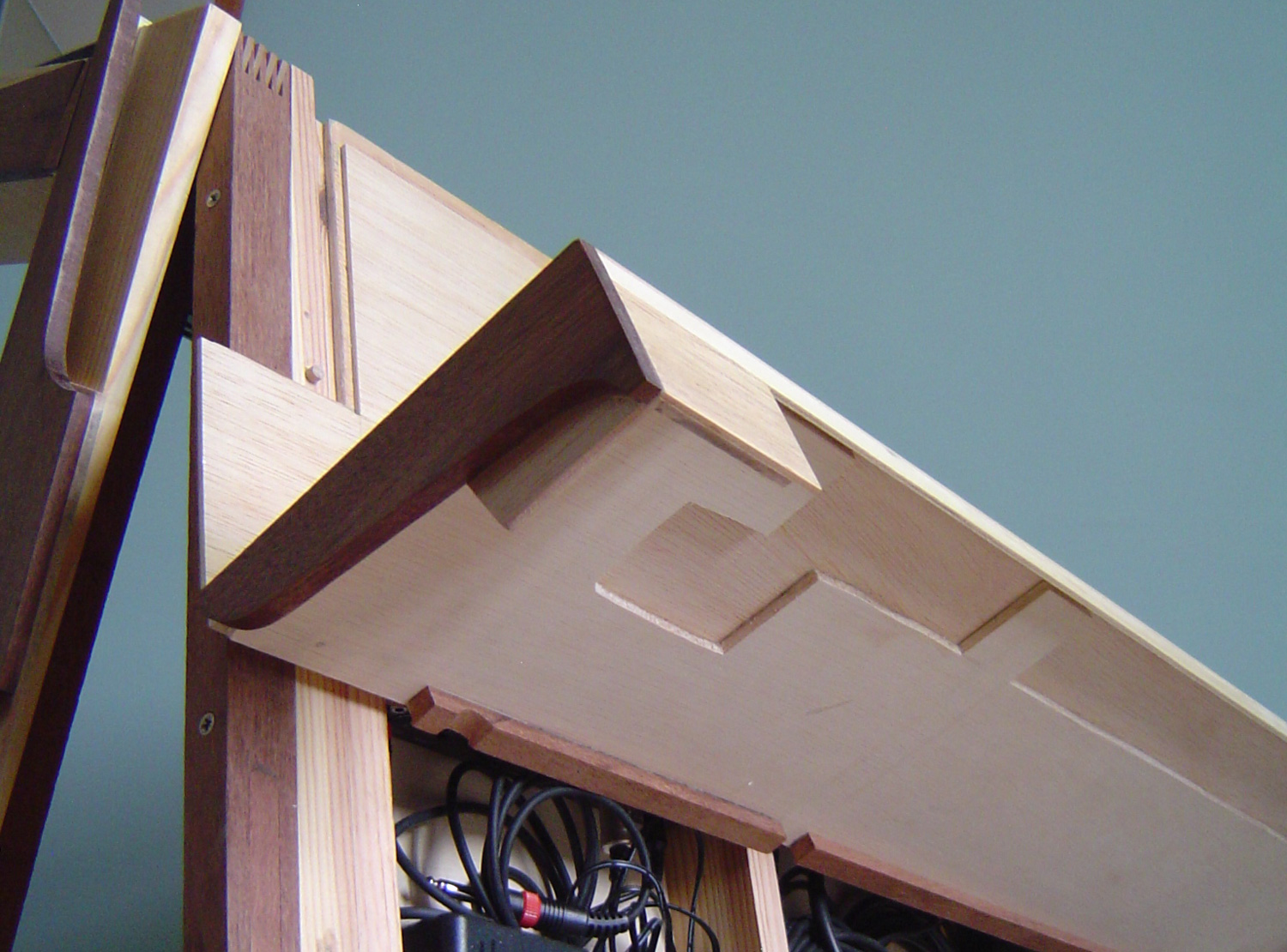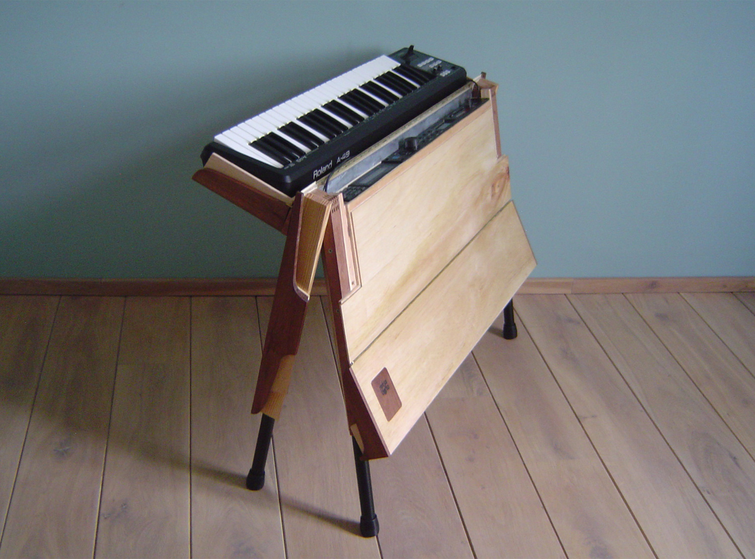 Deze doos is op maat gemaakt voor het opbergen van 2 midi-modules met bijbehorende snoeren. De uitklapbare poten kunnen verlengd worden voor de juiste hoogte en een klein midi-klavier met 49 toetsen past op de opengedraaide bovenklep. Het product is gemaakt van multiplex en grenen afgewerkt met Kers, de poten zijn van gerecupereerd hardhout en voorzien van houten scharnieren.