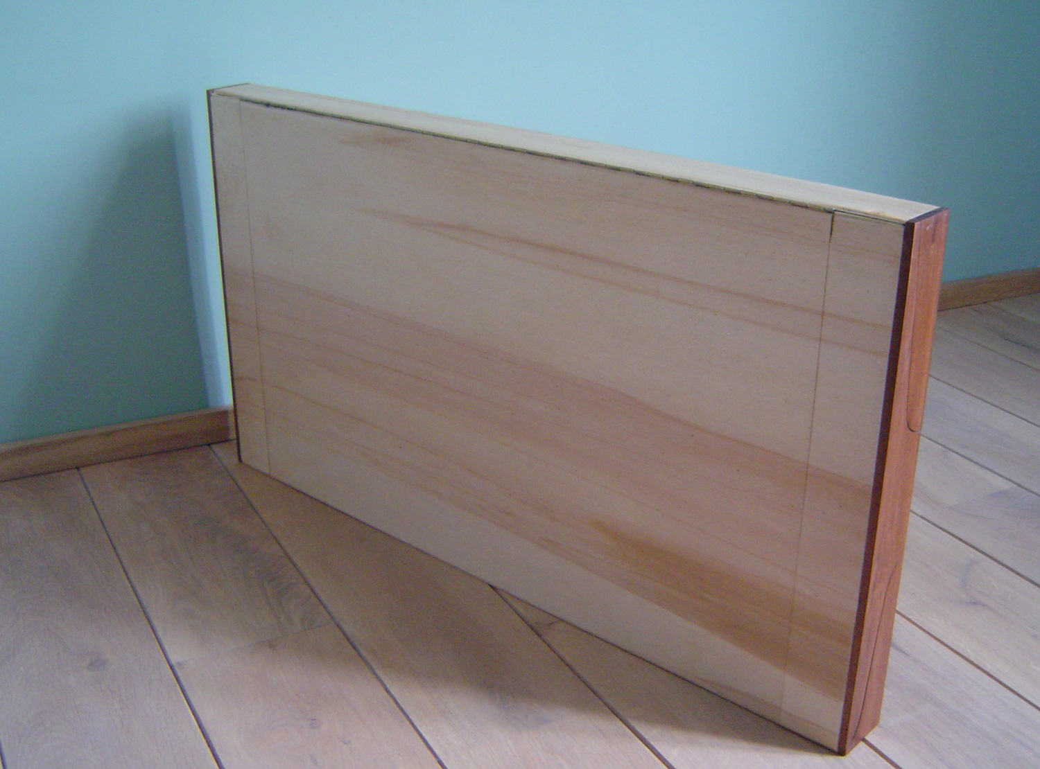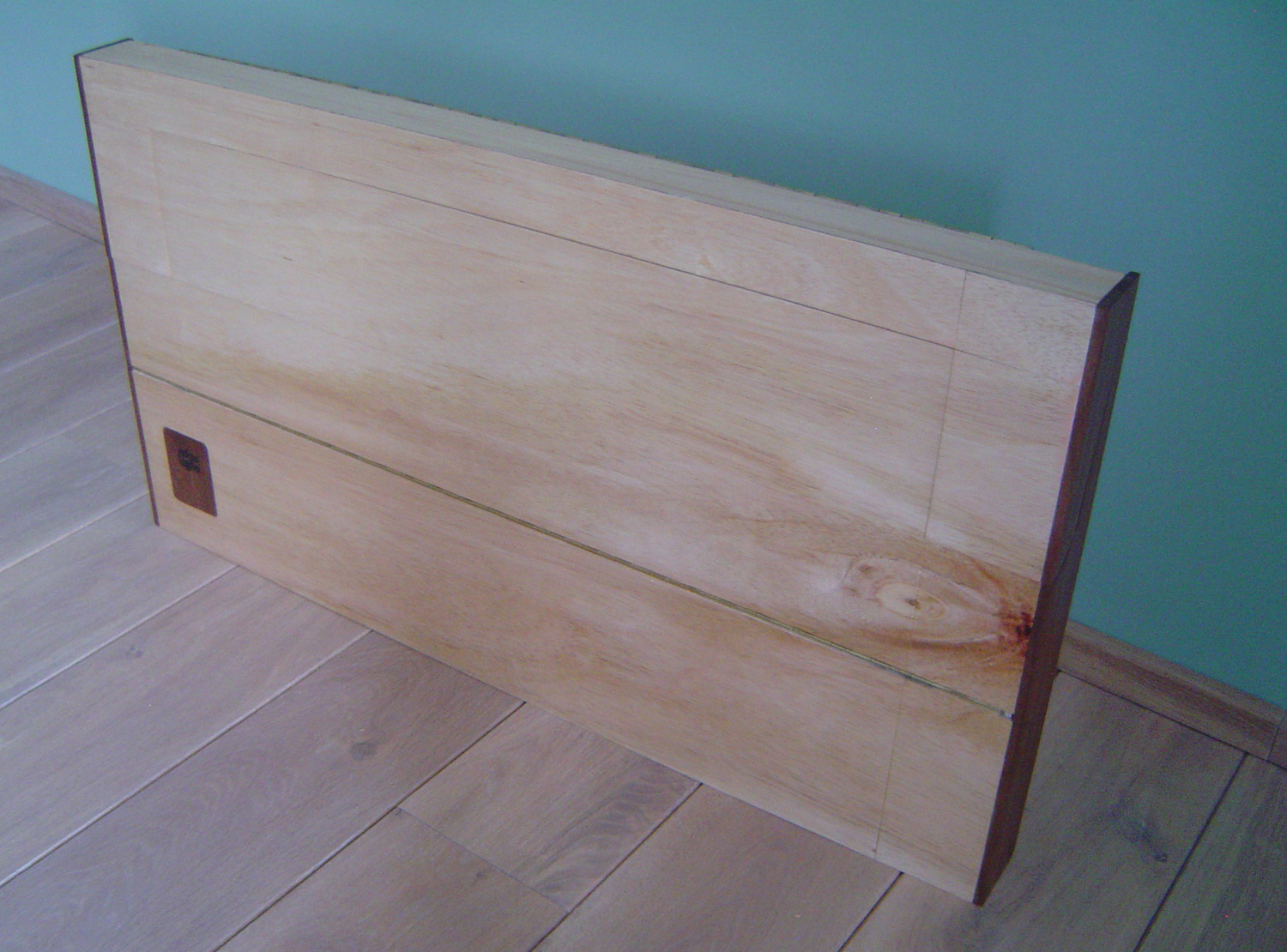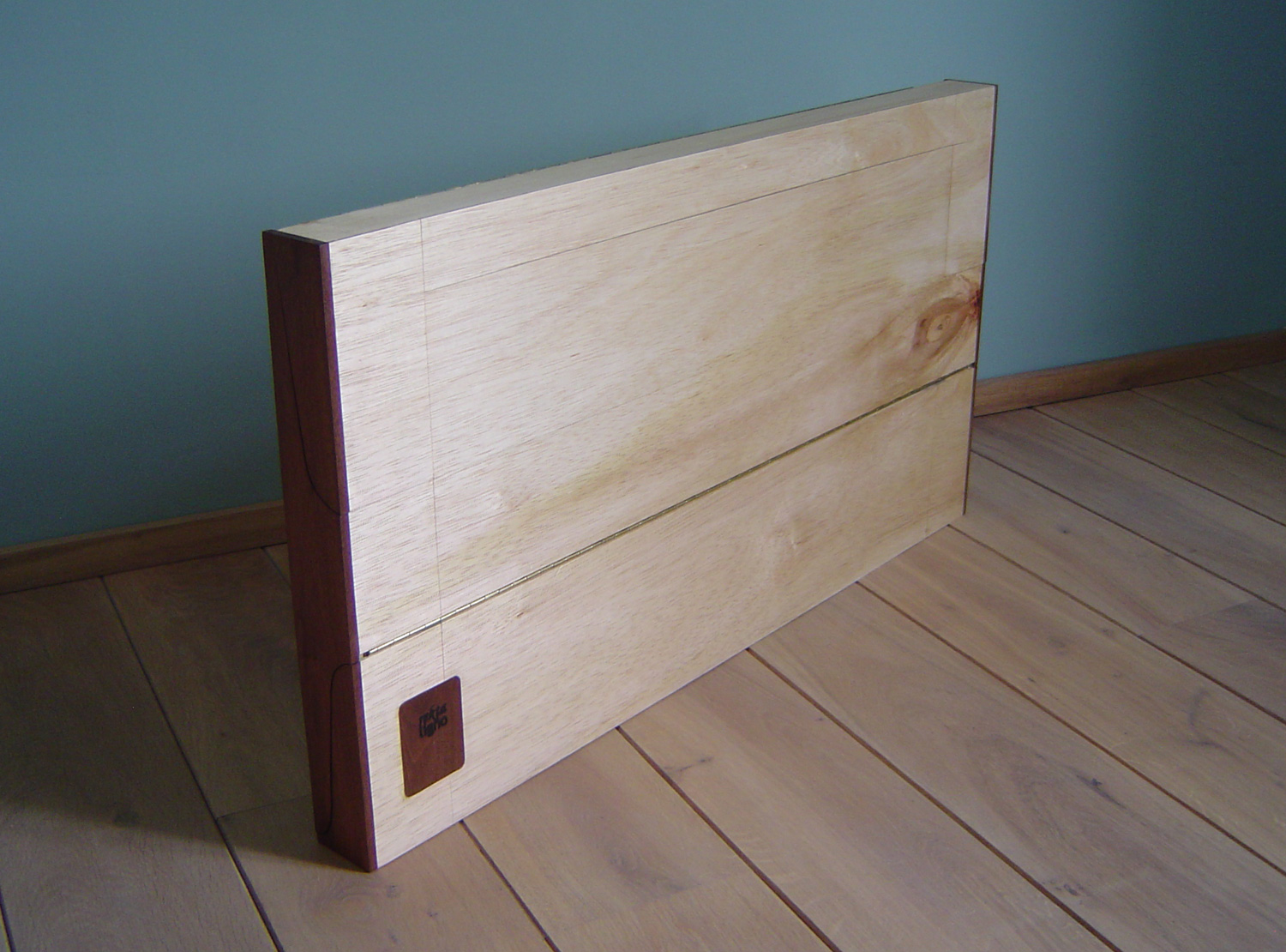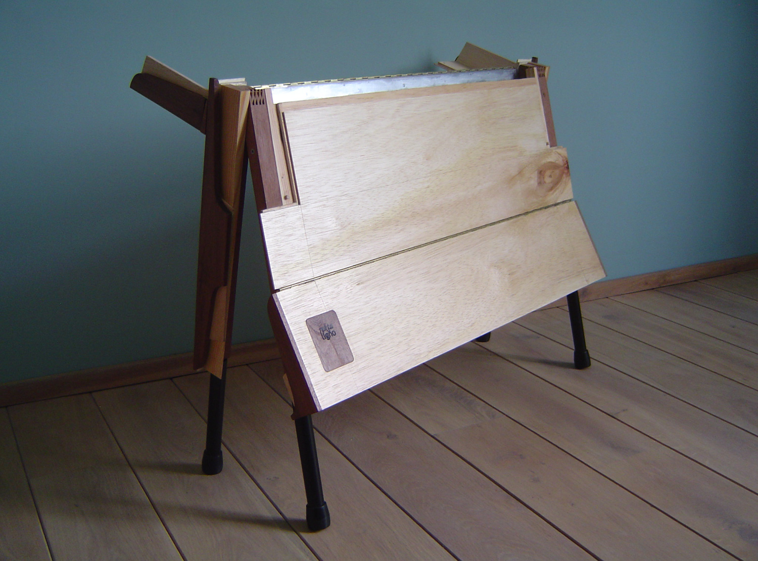 Deze doos is op maat gemaakt voor het opbergen van 2 midi-modules met bijbehorende snoeren. De uitklapbare poten kunnen verlengd worden voor de juiste hoogte en een klein midi-klavier met 49 toetsen past op de opengedraaide bovenklep. Het product is gemaakt van multiplex en grenen afgewerkt met Kers, de poten zijn van gerecupereerd hardhout en voorzien van houten scharnieren.