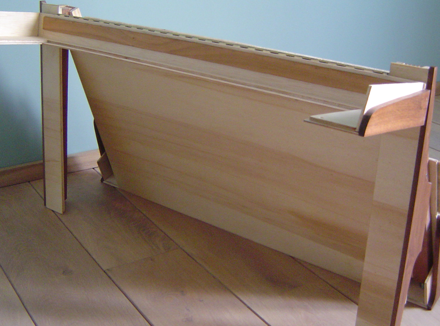 Op maat gemaakte houten box voor het opbergen van 2 midi-modules en in uitgeklapte toestand geschikt als keyboard standaard.